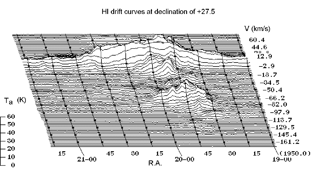 PDS supplies modulation and compensation modes of spectrometer operations. The last one is implemented with acoustic optical analyzer in the range of integration time up to 20--30 min. and gives advantage in sensitivity by two times. The data obtained are recorded to the computer hard disk and immediately displayed on the monitor. Then these data may be reduced to antenna temperature scale, cleaned from interferences and arranged to necessary format. Further they may be transmitted through the local network of the RATAN-600 to the central server or to any computer in the network. They may be accumulated on the Zip-diskettes too. An example of HI drift curves is shown on the Figure. ![]() The special soft ware was created for consequent reduction. It makes possible, in the first place, to see obtained data on the screen and to take any hard copy of drift curves, profiles or contours in any region of coordinates. Secondly, data may be reduced for