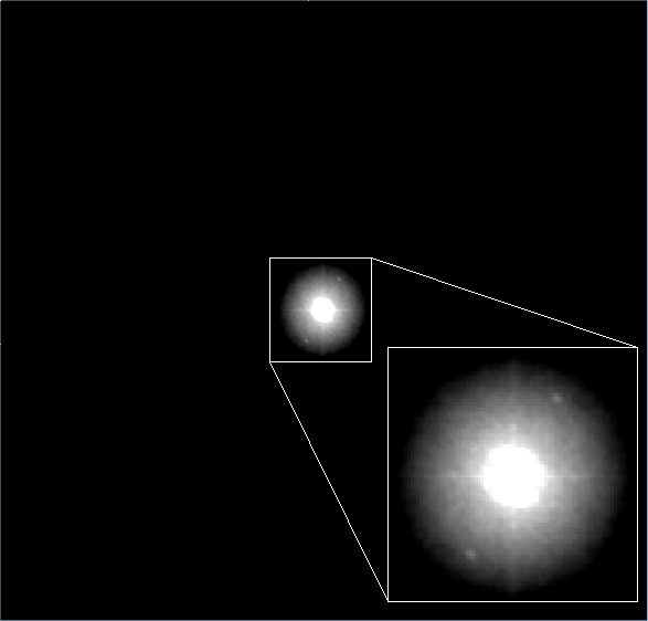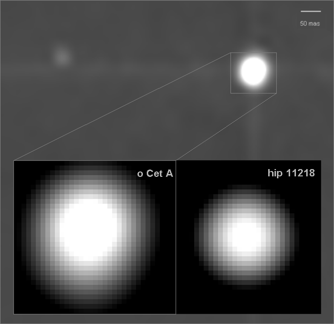 Восстановленные изображения системы o Cet и увеличенное изображение Миры в сравнении с изображением опорной звезды.