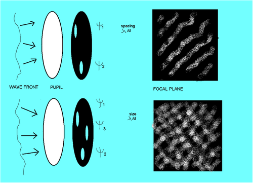 Нетрудно представить себе апертуру большого телескопа как совокупность множества субапертур с постоянно меняющимся расположением. Спекловая структура изображения в большом телескопе поэтому является интерференцией от всего множества субапертур, попадающих на входной зрачок. Количество этих воображаемых виртуальных субапертур определяется состоянием атмосферы на пути волны. В обычных условиях в видимом свете характерный размер неоднородностей (радиус корреляции) волнового фронта составляет ~ 10 см, поэтому для 6-метрового телескопа количество отдельных участков на зрачке составляет несколько тысяч. Еще раз обращаем внимание на то, что итоговая картинка переменна, так как формируется атмосферными неоднородностями, переносимыми ветром в разных направлениях, с различной скоростью и на разных высотах. Характерное время жизни (замороженности) картинки составляет 0.01 сек. Основной вклад в искажение изображений в телескопах вносит приземный слой высотой в несколько сотен метров, однако для учета всех слоев необходимо принимать во внимание высоты до 10 км.